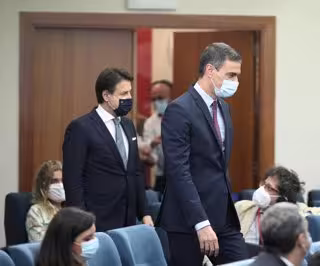 El primer ministro italiano, Giuseppe Conte (i), entra a la rueda de prensa convocada con los medios tras una reunión de trabajo con el presidente del Gobierno, Pedro Sánchez (d), en el Complejo de la Moncloa, Madrid (España), a 8 de julio de 2020. - Eduardo Parra - Europa Press