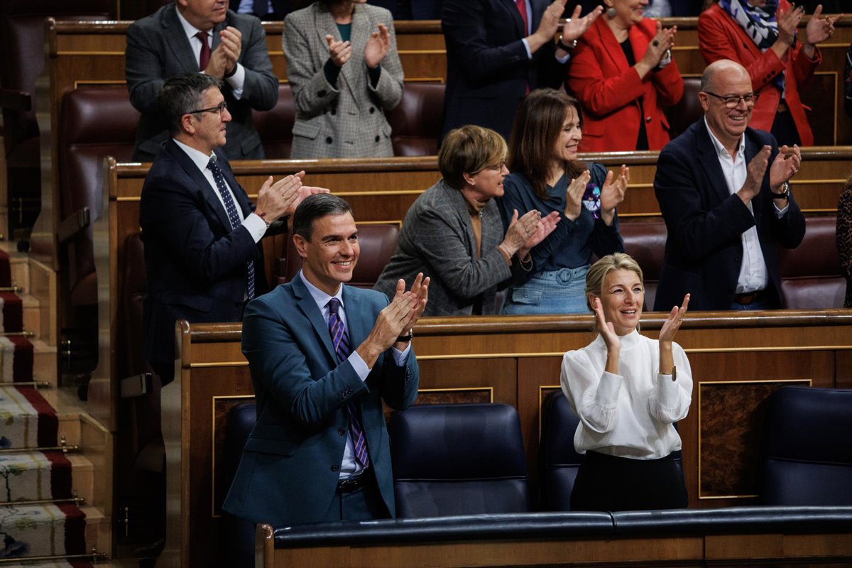 El presidente del Gobierno, Pedro Sánchez, y la vicepresidenta segunda y ministra de Trabajo y Economía Social, Yolanda Díaz, aplauden tras la aprobación de los PGE2023 en una sesión plenaria en el Congreso de los Diputados, a 24 de noviembre de 2022. - Alejandro Martínez Vélez - Europa Press