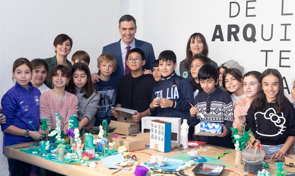 La ministra de Vivienda y Agenda Urbana, Isabel Rodríguez y el presidente del Gobierno, Pedro Sánchez, junto a niños que realizar una actividad durante la inauguración de la Casa de la Arquitectura, en La Arquería de Nuevos Ministerios. - Eduardo Parra - Europa Press
