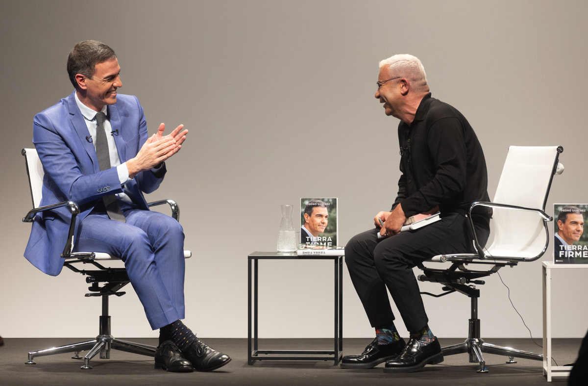El presidente del Gobierno, Pedro Sánchez (i) y el presentador de televisión, Jorge Javier Vázquez (d), durante la presentación del libro Tierra firme. - Eduardo Parra - Europa Press