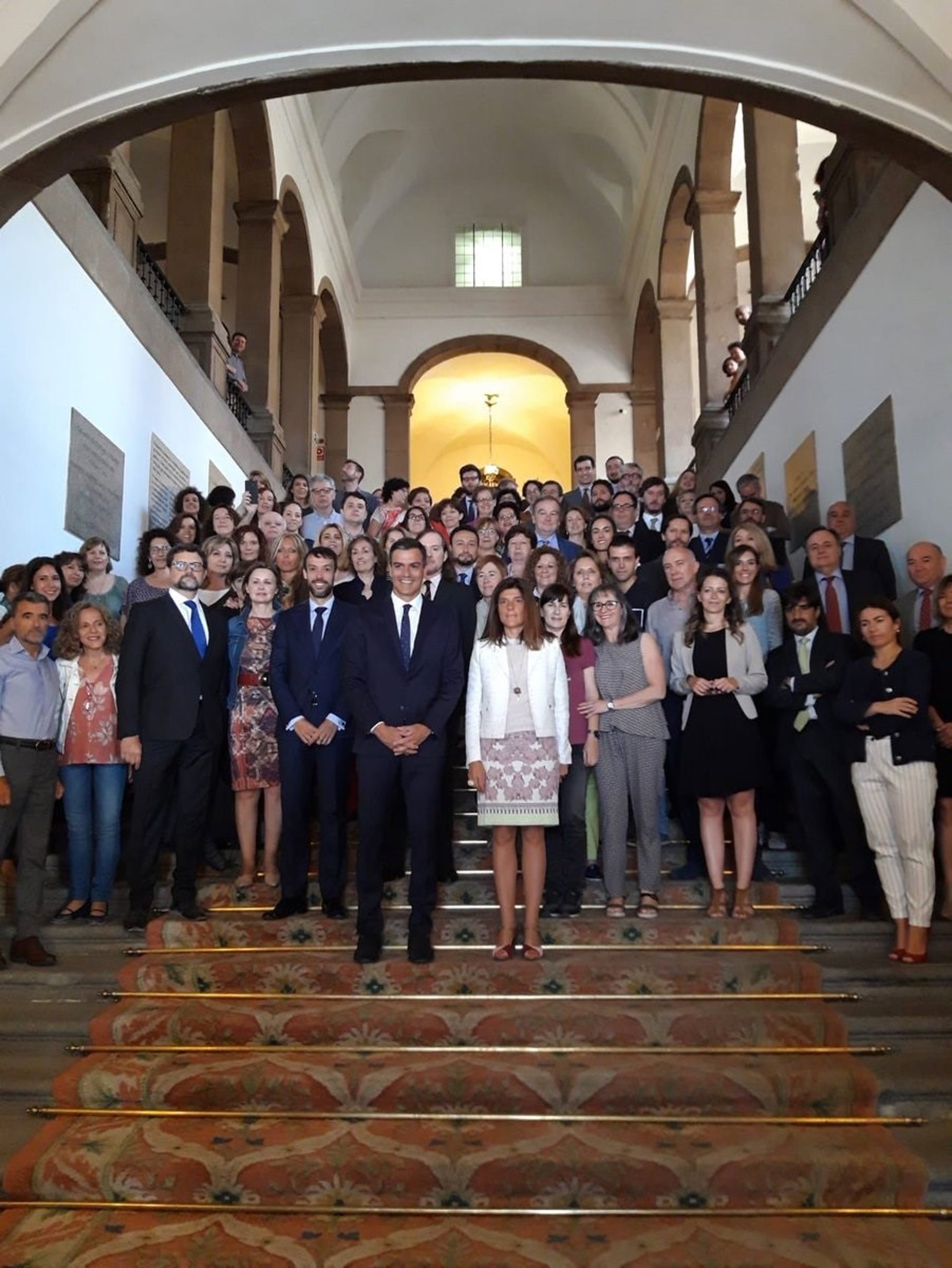 El Departamento que dirige Josep Borrell ha publicado varias fotografías en las que se ve al jefe del Ejecutivo en el Palacio de Santa Cruz, donde tienen despacho la cúpula del Ministerio y algunos departamentos --el grueso están en Torres Ágora--. Sánchez ha posado con ellos en la escalinata principal del edificio, junto a la subsecretaria del Ministerio, Ángeles Moreno.