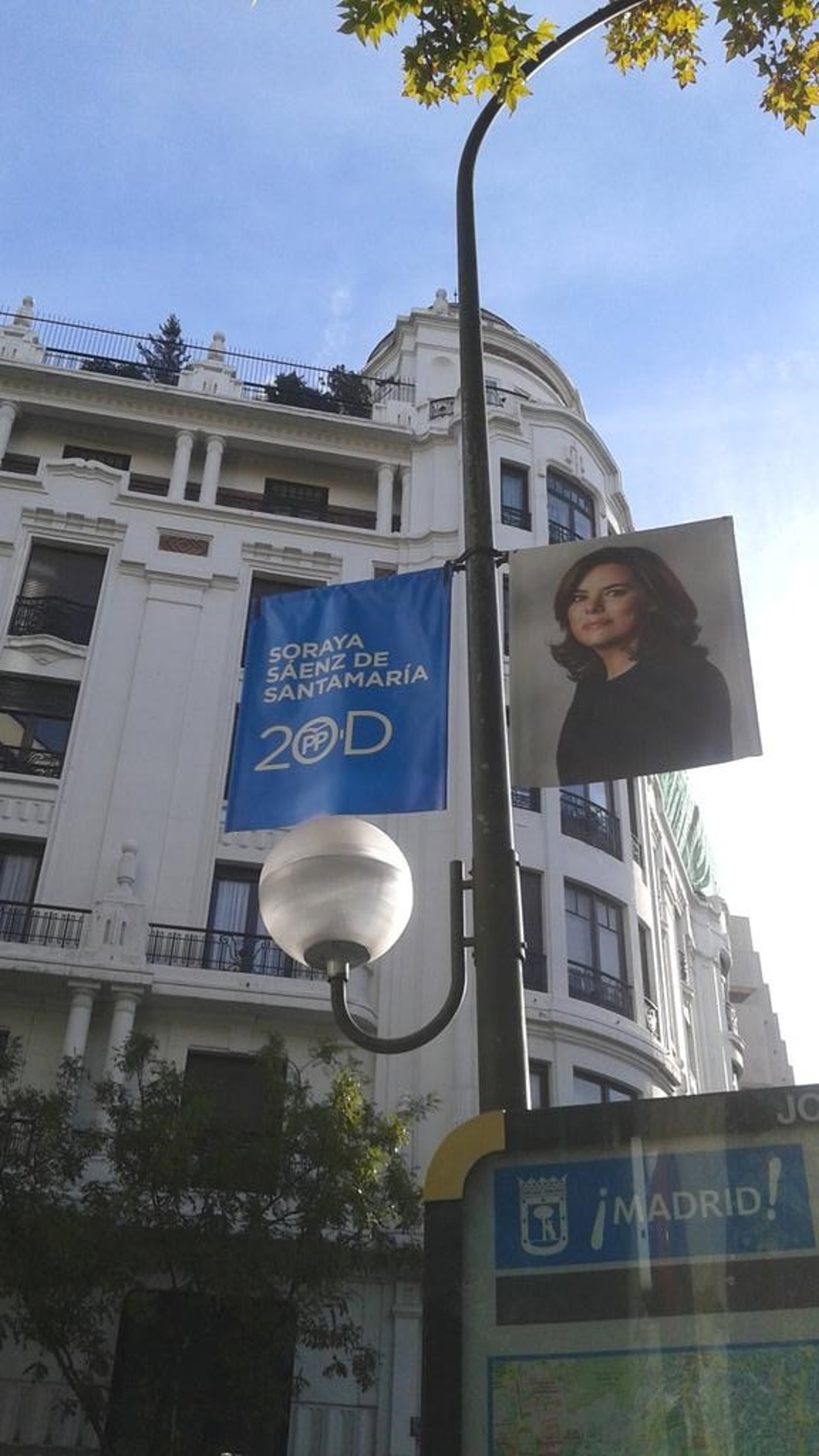 El Partido Popular ha colocado a la vicepresidenta del Gobierno, Soraya Sáenz de Santamaría, en la cartelería publicitaria de la campaña electoral en Madrid, además de las fotos del presidente y candidato a la reelección, Mariano Rajoy.