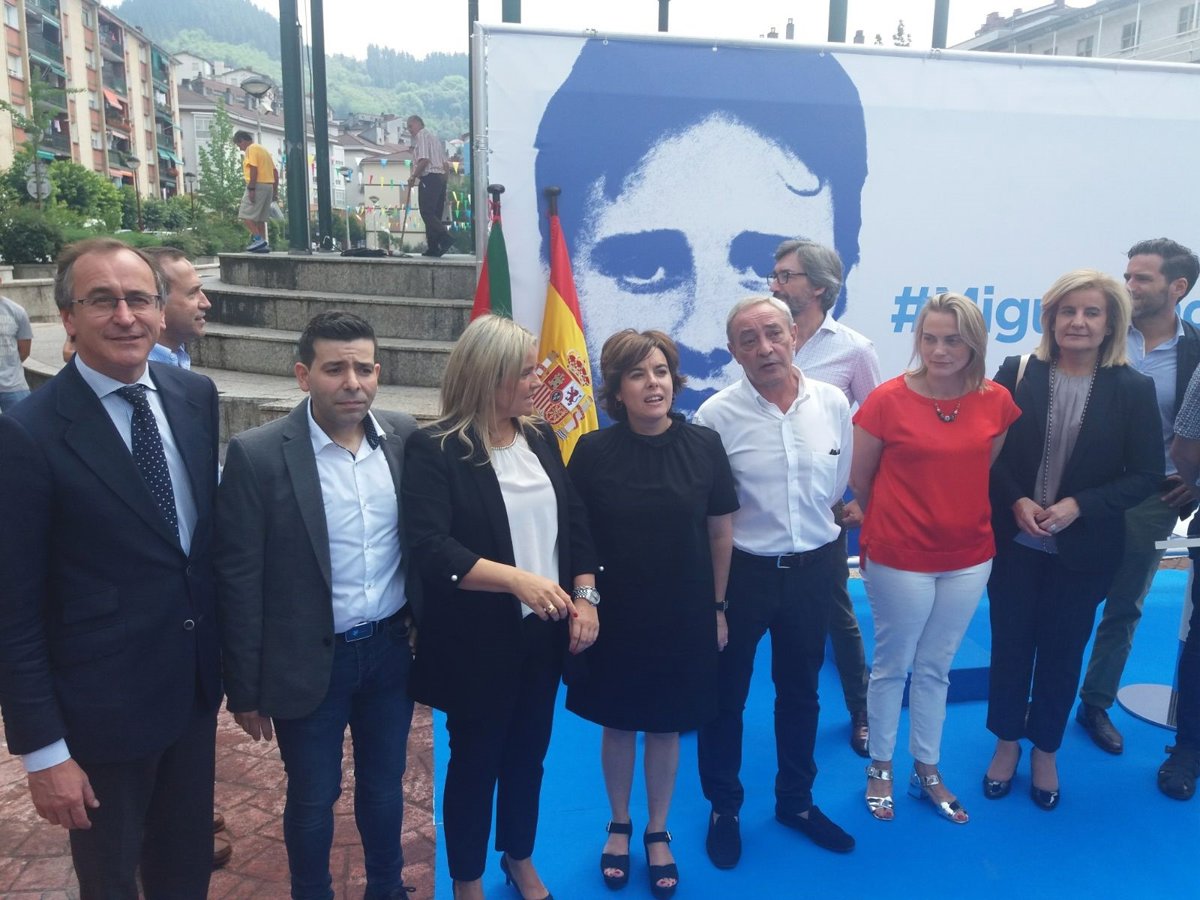 Santamaría, junto con la exministra de Trabajo, Fatima Báñez ha acudido a Ermua, donde se ha celebrado, en la plaza San Pelayo, el acto de homenaje al concejal del PP Miguel Ángel Blanco, asesinado hace 21 años por ETA, al que ha asistido su hermana, Mari Mar Blanco, presidenta de la Fundación de Víctimas del Terrorismo, además de una amplia presencia de representantes del PP, entre ellos, el presidente del partido en el País Vasco, Alfonso Alonso.