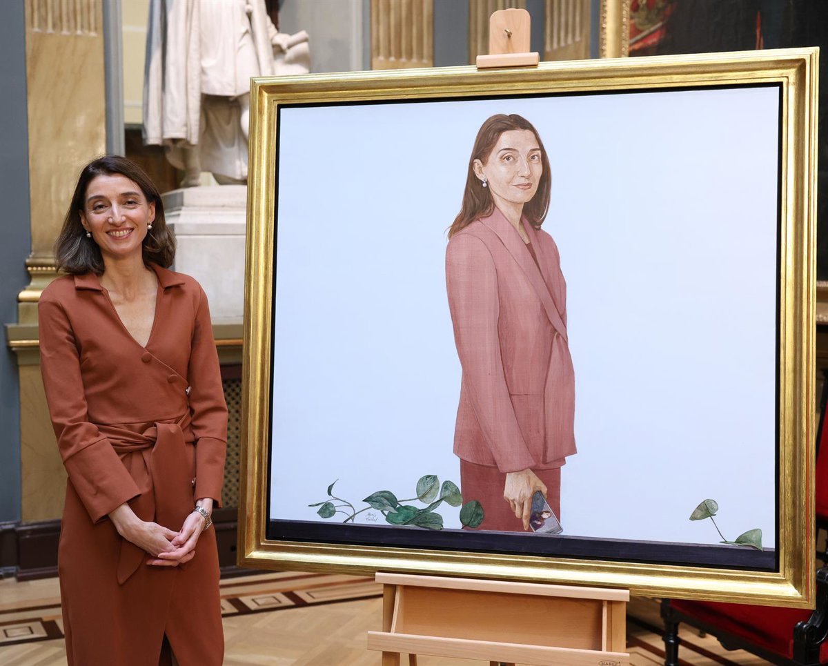 La obra, en la que aparece Llop de perfil sobre un fondo blanco, con un móvil en la mano y rodeada de un hilo de plantas, ha sido realizada por la artista María Bisbal, que también fue la encargada de realizar el retrato al expresidente de la Cámara Alta Manuel Cruz, predecesor de la dirigente socialista.