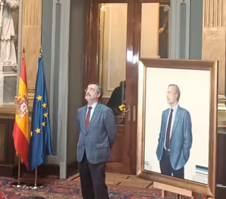 La obra, que contiene el dibujo del libro 'el transeúnte de la política', ha sido realizada por la artista María Bisbal, que fue la encargada de realizar retratos como el de Ángel Gabilondo en el Ministerio de Educación y el de Alberto Ruiz-Gallardón en la Alcaldía de Madrid.
