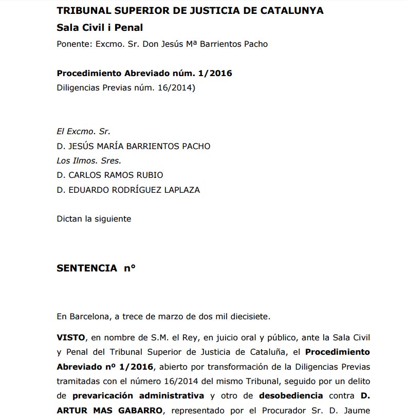El Tribunal Superior de Justicia de Catalunya (TSJC) ha condenado al expresidente de la Generalitat Artur Mas a dos años de inhabilitación por desobedecer al Tribunal Constitucional (TC) con la consulta sobre la independencia de Catalunya del 9 de noviembre de 2014.