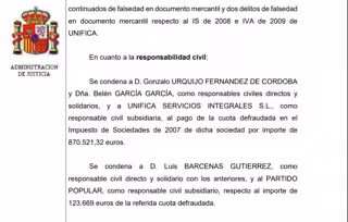 Consulta aquí al completo la sentencia de la Audiencia Nacional en la que se condena al ex tesorero general del PP Luis Bárcenas a 2 años de cárcel por pagar en 'b' más de 1 millón de euros de las obras de reforma de la sede 'popular' de Génova, al tiempo que al Partido Popular como responsable civil subsidiario de Bárcenas en la cuantía de 123.669 euros por el impuesto de Sociedades de Unifica de 2007.