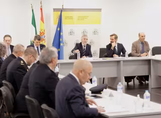 El ministro del Interior, Fernando Grande-Marlaska (c), junto al delegado de Gobierno en Andalucía, Pedro Fernández (2i), durante la reunión. A 9 de febrero de 2024, en Cádiz (Andalucía, España). - Nono Rico