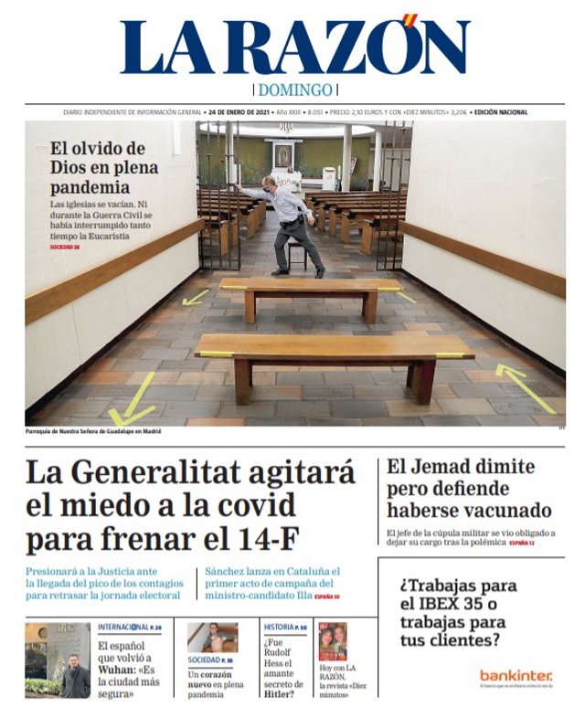 LA RAZÓN: "El olvido de Dios en plena pandemia"; "La Generalitat agitará el miedo a la Covid para frenar el 14-F"; "El Jemad dimite pero defiende haberse vacunado"; "El español que volvió a Wuhan: 'Es la ciudad más segura'"; "Un corazón en plena pandemia"; "¿Fue Rudolf Hess el amante secreto de Hitler?".