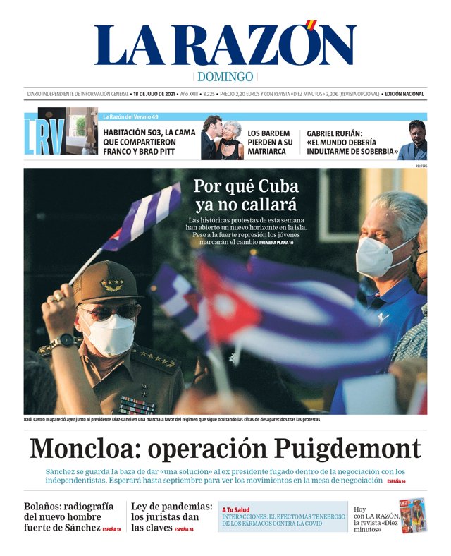 LA RAZÓN: "Por qué Cuba ya no callará"; "Habitación 503, la cama que compartieron Franco y Brad Pitt; "Los Bardem pierden a su matriarca"; "Gabriel Rufián: "El mundo debería indultarme de soberbia""; "Moncloa: operación Puigdemont"; "Bolaños: radiografía del nuevo hombre fuerte de Sánchez; "Ley de pandemias: los juristas dan las claves".