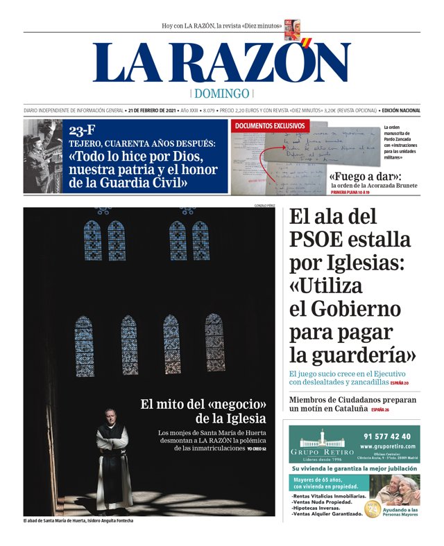 LA RAZÓN: "23-F. Tejero, cuarenta años después: "Todo lo hice por Dios, nuestra patria y el honor de la Guardia Civil""; ""Fuego a dar": la orden de la Acorazada Brunete"; "El ala del PSOE estalla por Iglesias: "Utiliza el Gobierno para pagar la guardería""; "El mito del "negocio" de la Iglesia"; "Miembros de Ciudadanos preparan un motín en Cataluña".