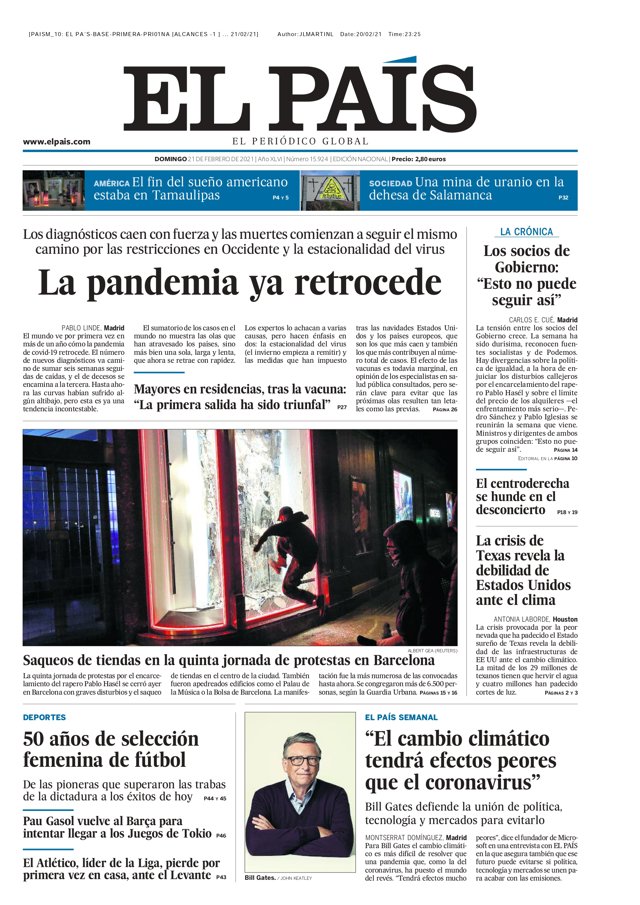 EL PAÍS: "La pandemia ya retrocede"; "El fin del sueño americano estaba en Tamaulipas"; "Una mina de uranio en la dehesa de Salamanca"; "El centroderecha se hunde en el desconcierto"; "La crisis de Texas revela la debilidad de Estados Unidos ante el clima"; "Saqueos de tiendas en la quinta jornada de protestas en Barcelona"; "50 años de selección femenina de fútbol"; "Pau Gasol vuelve al Barça para intentar llegar a los Juegos de Tokio"; "El Atlético, líder de la Liga, pierde por primera vez en casa, ante el Levante"; "El cambio climático tendrá efectos peores que el coronavirus".