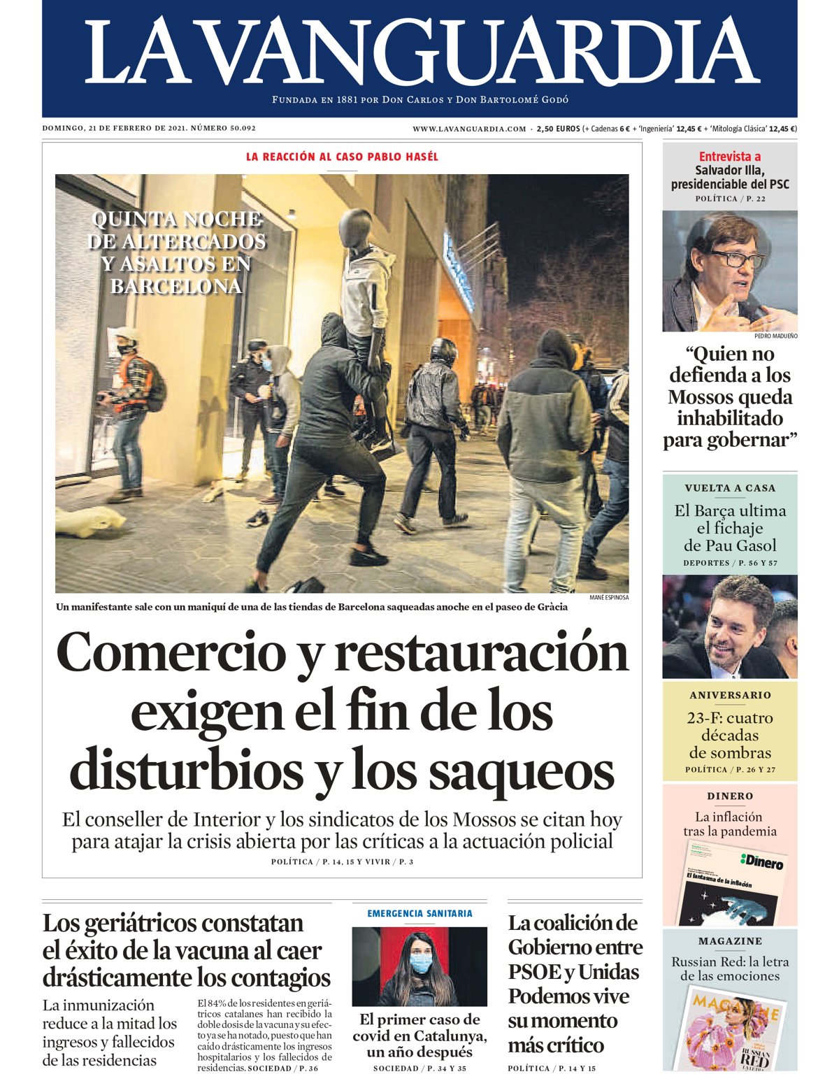 LA VANGUARDIA: "Comercio y restauración exigen el fin de los disturbios y los saqueos"; "Entrevista a Salvador Illa, presidenciable del PSC: "Quien no defienda a los Mossos queda inhabilitado para gobernar"; "El Barça ultima el fichaje de Pau Gasol"; "Los geriátricos constatan el éxito de la vacuna al caer drásticamente los contagios"; "El primer caso de covid en Catalunya, un año después"; "La coalición de Gobierno entre PSOE y Unidas Podemos vive su momento más crítico"; "23-F: cuatro décadas de sombras"; "La inflación tras la pandemia"; "Russian Red: la letra de las emociones".