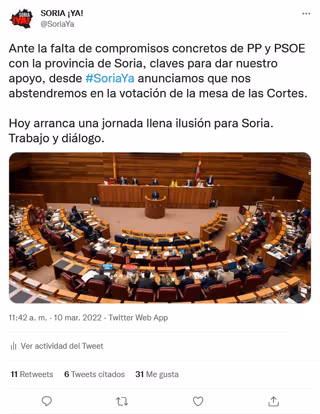 Asimismo, Soria ¡Ya! ha explicado que en el transcurso de las negociaciones mantenidas con otras fuerzas políticas, el Partido Socialista "no ha concretado ninguna oferta interesante para la provincia de Soria" que inclinara su voto "a favor de su candidata a presidir las Cortes".
