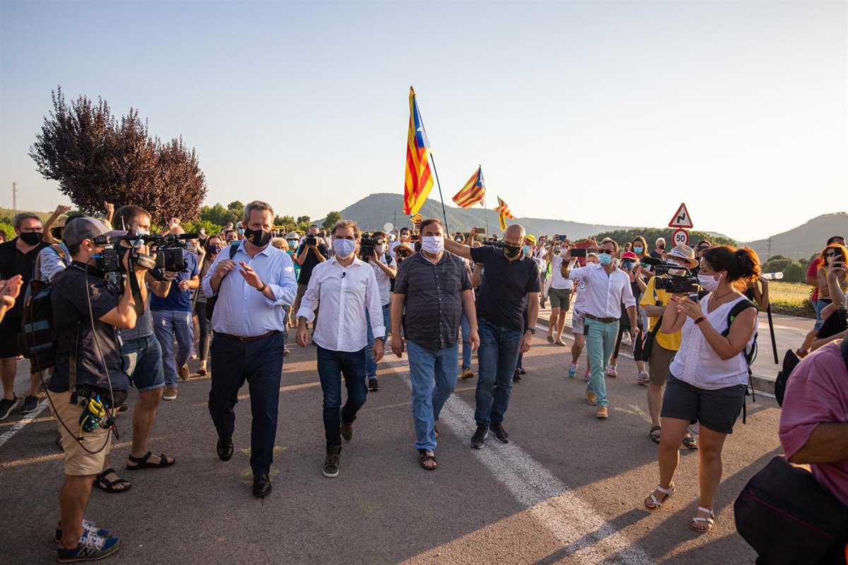 (I-D) El exconseller Joaquim Forn; el presidente de mnium, Cuixart; el líder de ERC, Oriol Junqueras; y el exconseller Raül Romeva, en su comparecencia antes de su nuevo ingreso en prisión en Sant Joan de Vilatorradaa el 28 de julio de 2020. - Pau Venteo - Europa Press - Archivo