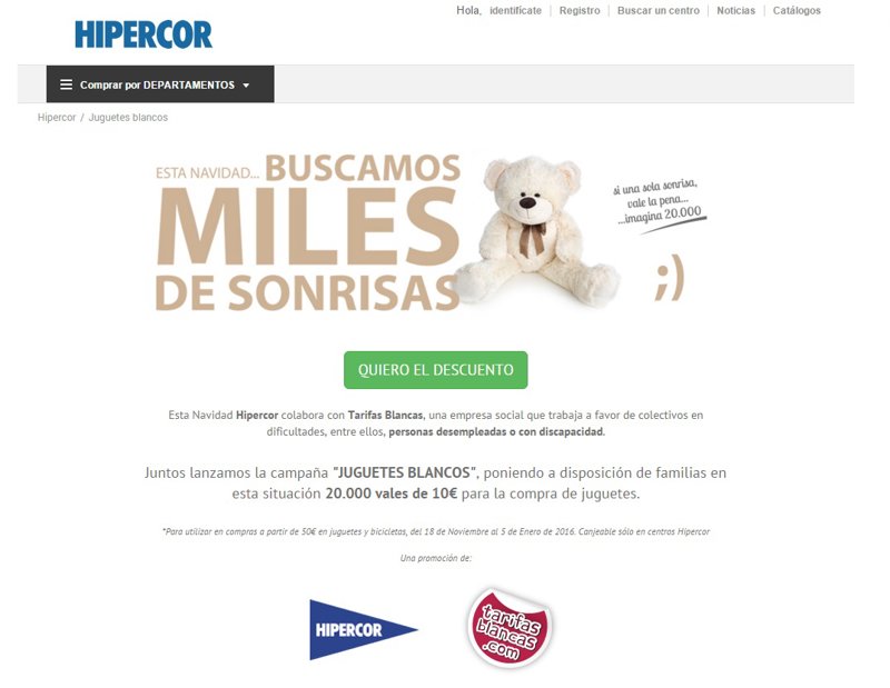 De cara a la campaña navideña, los responsables de Tarifas Blancas se muestran "convencidos" de que la compra de juguetes en Navidad para estos colectivos significa, además de un esfuerzo económico (en España, el gasto medio por cada niño asciende a 135 euros, según la AEFJ), "un problema que trasciende lo emocional". Por este motivo, han lanzado la campaña "Juguetes Blancos", por la que 20.000 familias podrán beneficiarse de descuentos en la adquisición de juguetes y biciletas para lso más pequeños.