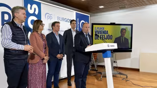 Tellado en su intervención en Burgos, junto a los senadores Javier Lacalle y Raquel González, el presidente del PP y de la Diputación, Borja Suárez y el diputado Ángel Ibáñez. - EUROPA PRESS