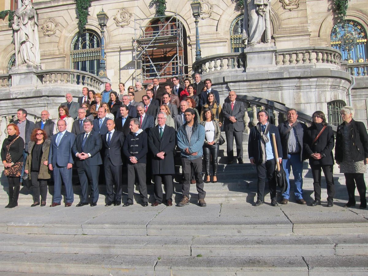 La concentración ha estado encabezada por el alcalde, Juan María Aburto, el primer teniente de alcalde, Ricardo Barkala, el segundo teniente de alcalde, Alfonso Gil, y los portavoces de los grupos municipales del PNV, Nekane Alonso, del PP, Luis Eguíluz, de Udalberri, Carmen Muñoz, y de Goazen Bilbao, Francisco Samir Ladhou.