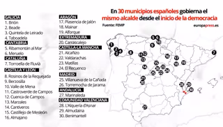 Los datos facilitados por la Federación Española de Municipios y Provincias (FEMP) apuntan que son 30 los consistorios con el mismo alcalde: Castilla y León tiene nueve, cuatro son de Castilla-La Mancha, tres de Zaragoza, tres de Alicante y otros tantos de Orense, dos de Cantabria y otros dos de Madrid y uno, respectivamente, de Cáceres, Sevilla y Coruña. En Navarra también había un alcalde desde 1979, en el pueblo de Enériz, pero lo dejó poco después de las elecciones de 2015.