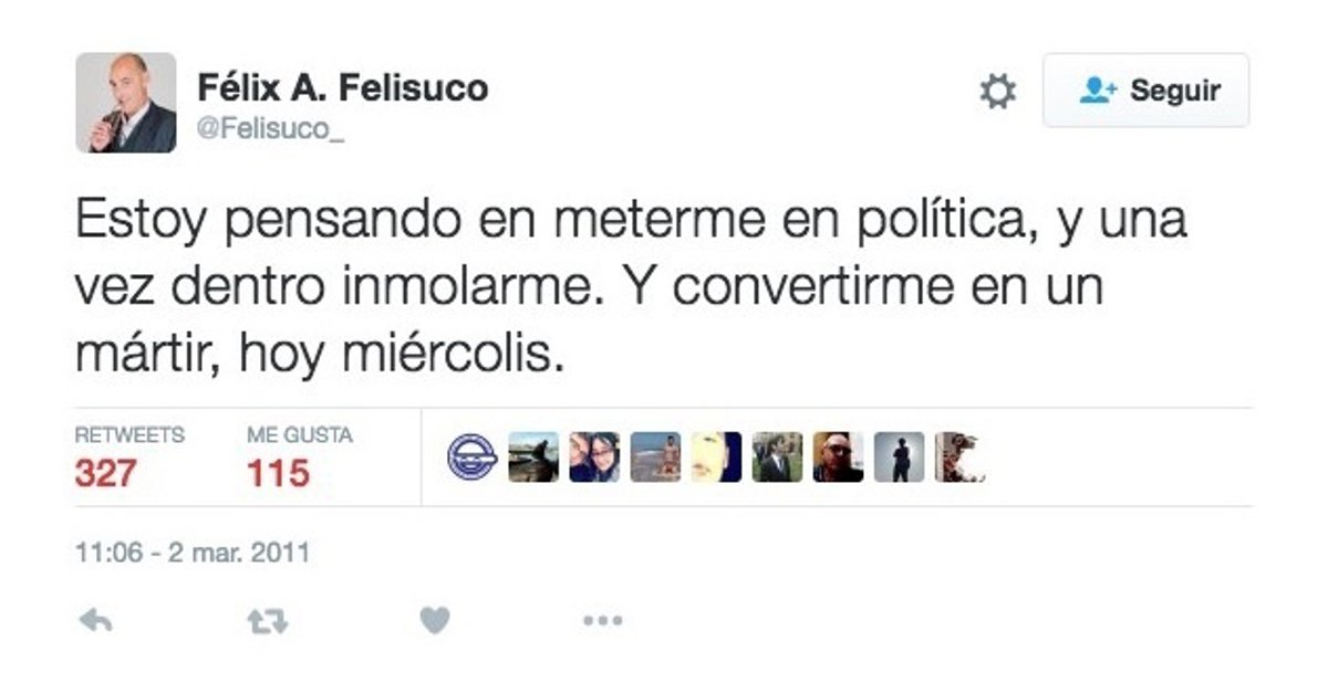 Felisuco, nombre popular e 'informal' por el que se conoce al cómico y presentador de televisión Félix Álvarez, tuiteó el 2 de marzo de 2011: "Estoy pensando en meterme en política, y una vez dentro inmolarme. Y convertirme en un mártir, hoy miércolis". El tuit tuvo al menos 327 retuits y 115 Me Gusta. Han pasado 5 años, pero ya se sabe que los tuits ahí quedan... Salvo que los elimines.