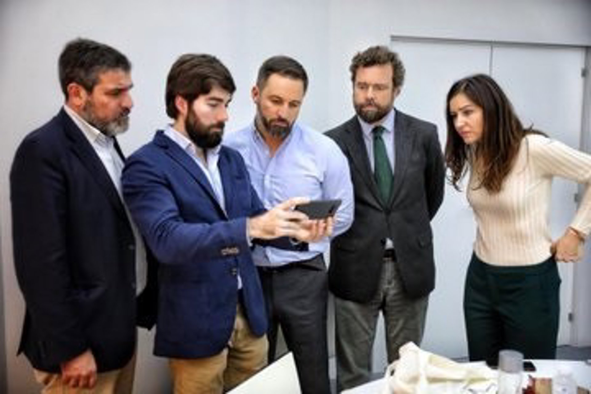El presidente de Vox, Santiago Abascal, junto al portavoz en el Congreso, Iván Espinosa de los Monteros, y el diputado Manuel Mariscal - VOX