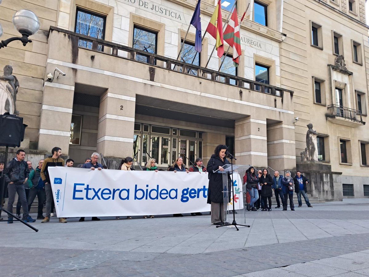 Tras un pancarta en la que se podía leer 'Etxera bidea gertu' (cerca del camino a casa), portavoces de ELA y CNT han leído un comunicado en el que han denunciado el "sufrimiento" generado por la política de alejamiento, y se han sumado a la demanda 'Etxera Bidea Gertu' del colectivo en apoyo a los presos etarras Sare.