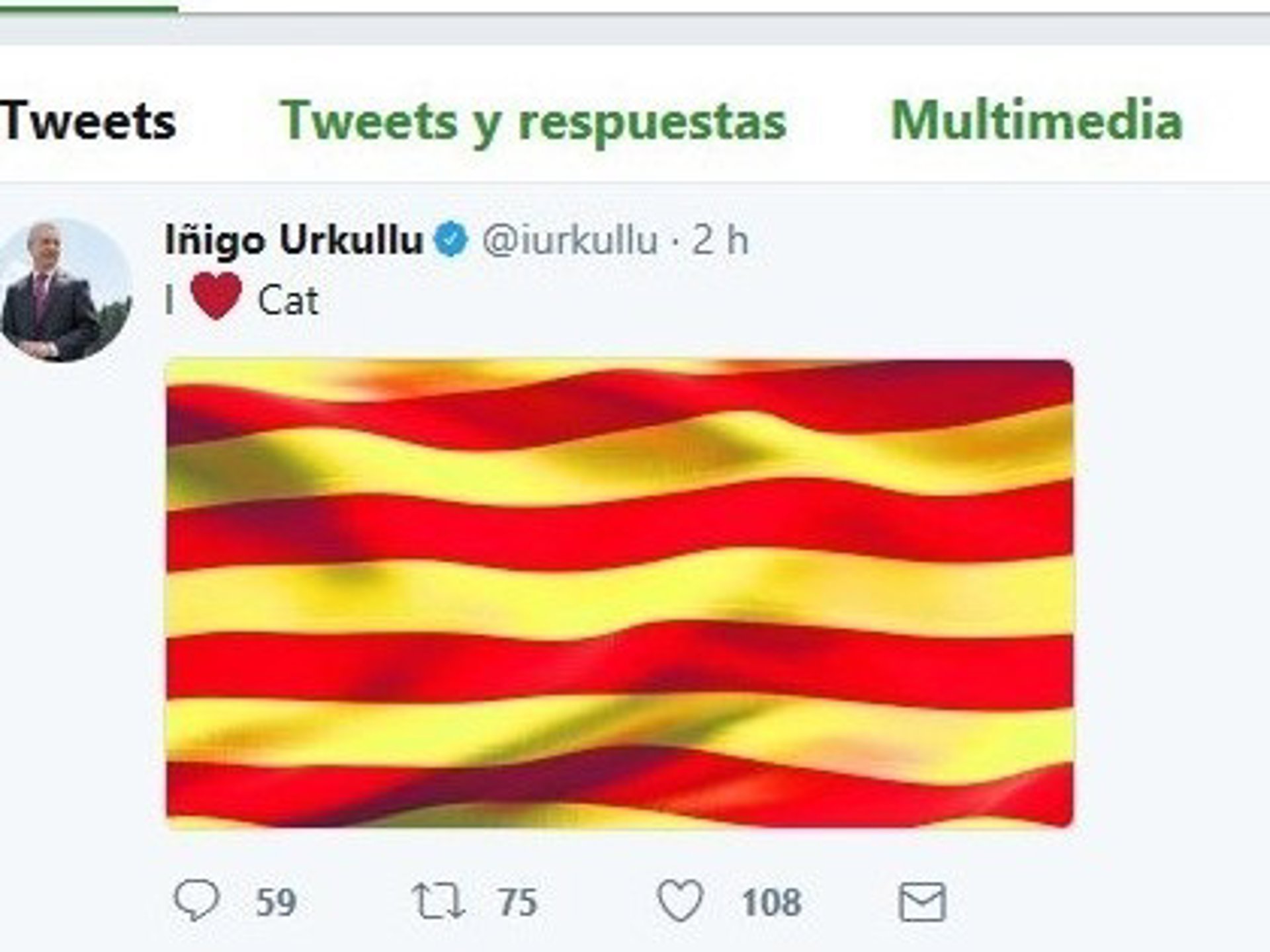 El lehendakari, Iñigo Urkullu, ha hecho público este jueves un mensaje, en sus cuentas oficiales en las redes sociales, en el que expresa su cariño a Cataluña, con un mensaje con el texto 'I Love Cat' y una imagen de la bandera oficial de la comunidad catalana.