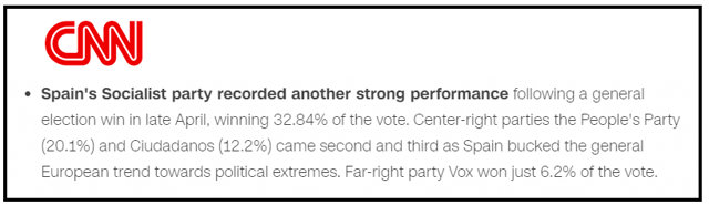 Fuera del continente europeo, la CNN recoge el resultado de España junto al de otros países europeos en los comicios comunitarios y considera que contrarresta "la tendencia general europea hacia los extremos políticos".