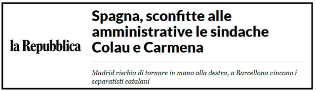 En el caso de Italia, la Repubblica describe el resultado de Madrid y Barcelona como una "derrota" para Ada Colau y Manuela Carmena. El estado en la capital es descrito como una "vuelta a la derecha", mientras que en Barcelona "ganan los separaratistas catalanes". También califica de "desastre" la posición de Manuel Valls.