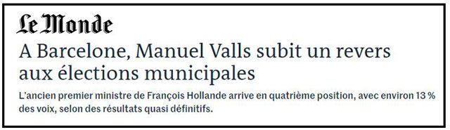 Además, el medio francés se hace eco del resultado de Barcelona, que califica de un "revés" para el candidato y ex primer ministro francés Manuel Valls. "Era una apuesta arriesgada y él lo sabía", relata.