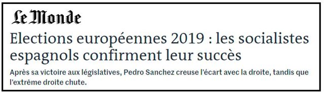 El Diario Le Monde hacía esta mañana una lectura del "éxito" del PSOE en las elecciones europeas. Pedro Sánchez "amplía la brecha con la derecha, mientras que la extrema derecha cae", explica el artículo.