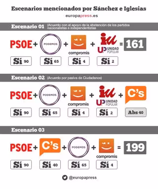 - El acuerdo 'por pasiva' de Ciudadanos: es una posibilidad que ha mencionado Pablo Iglesias en su intervención. Supondría el apoyo de Podemos, Compromís e Izquierda Unida a Pedro Sánchez y la abstención de Ciudadanos. No sería suficiente para ser investido en primera vuelta, pero sí en segunda.