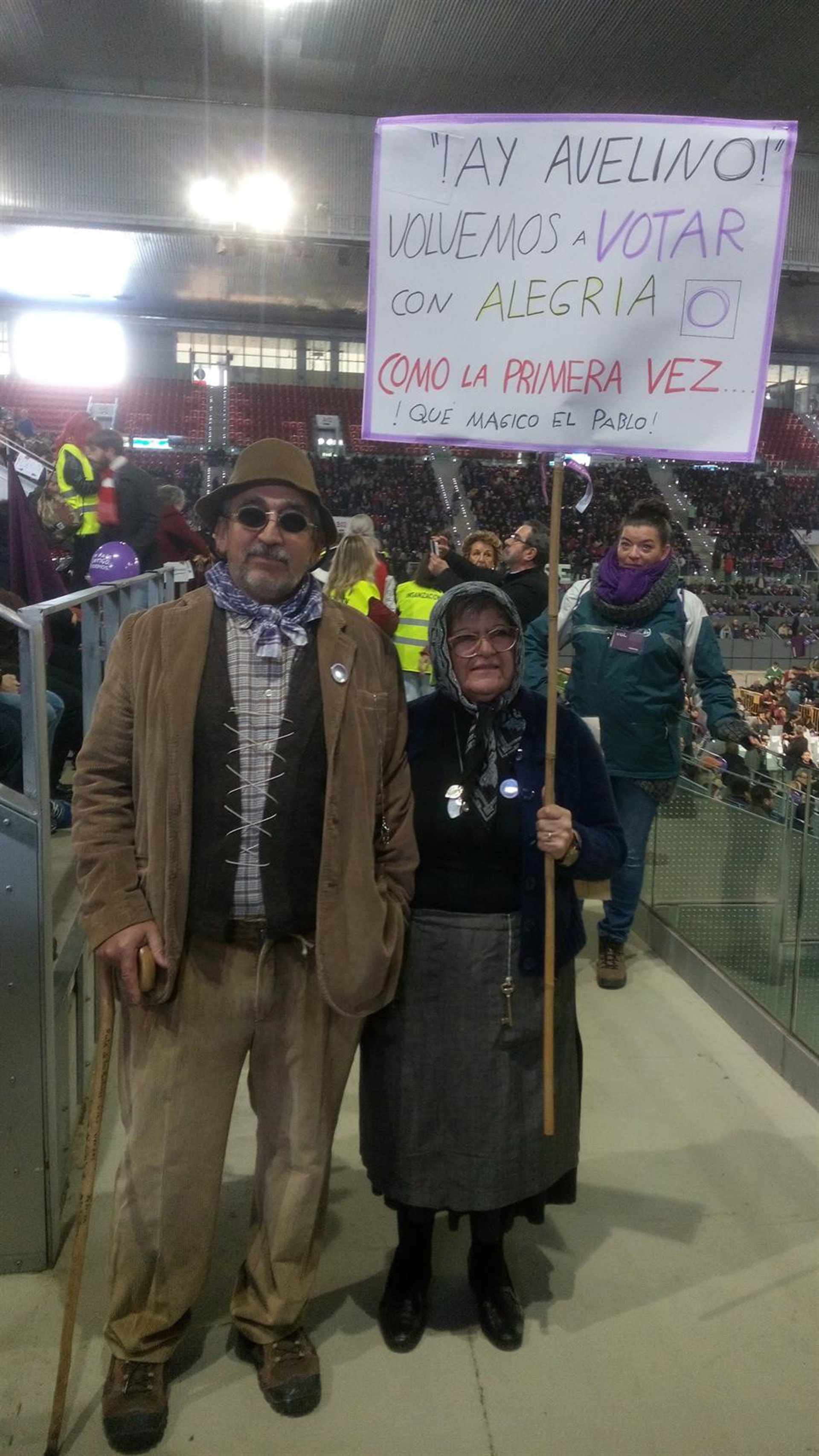 Es el caso de Marisa y Avelino, dos simpatizantes de Móstoles que han acudido al mitin de Madrid a escuchar al candidato a la Moncloa, Pablo Iglesias, disfrazados de 'abuelos rurales', portando una pancarta en la que se podía leer el siguiente mensaje: 'Ay Avelino. Volvemos a votar con alegría como la primera vez ¡Qué 'magico' el Pablo!".