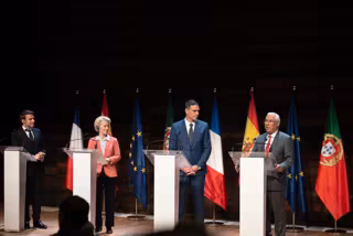 Archivo - (I-D) El presidente de Francia, Emmanuel Macron; la presidenta de la Comisión Europea, Ursula Von Der Leyen; el presidente del Gobierno de España, Pedro Sánchez y el primer ministro de Portugal, Antonio Costa, durante una declaración conjunta - Roberto Plaza - Europa Press - Archivo