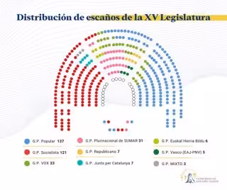 El diseño finalmente aprobado reserva el bloque de la izquierda al PSOE salvo diez asientos para Junts y el Grupo Mixto, mientras que el tercio de la derecha lo comparten el PP y Vox y, como no hay hueco para todos, parte de sus diputados son desplazados a las filas superiores del 'quesito central'. Las principales filas de esa parte central del hemiciclo se la reparten Sumar y Bildu a la izquierda y PNV y ERC a la derecha.