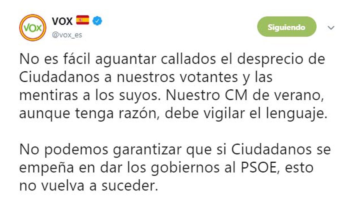 "Nuestro CM de verano, aunque tenga razón, debe vigilar el lenguaje", ha recalcado Vox sobre el mensaje anterior en el que se tildaba de "acojonado y sinvergüenza" a Rivera y se la acusaba de "lamerle el culo" al presidente francés, Emmanuel Macron.