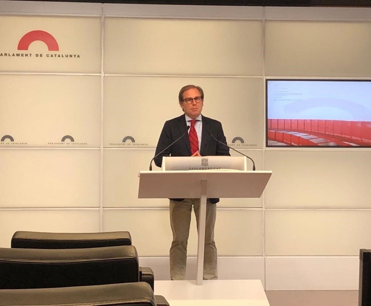 El portavoz de Vox en el Parlament, Joan Garriga, este martes en rueda de prensa en el Parlament - EUROPA PRESS