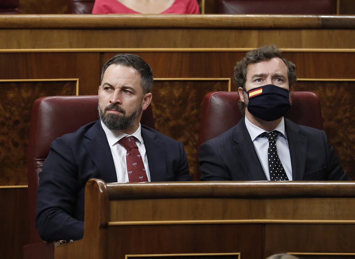 El portavoz del VOX en el Parlamento, Iván Espinosa de los Monteros y el presidente del partido, Santiago Abascal, en sus escaños del Congreso - Javi Martínez / Pool - Archivo