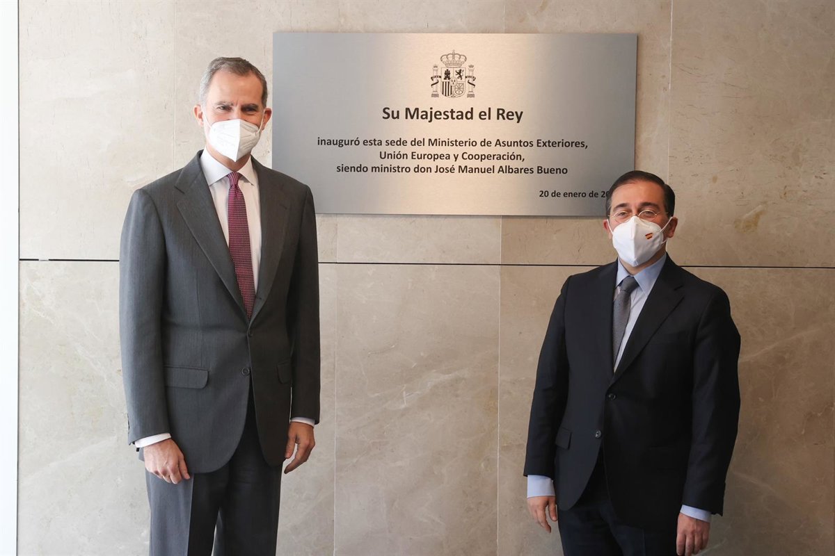 El Rey ha inaugurado esta mañana la nueva sede del Ministerio de Exteriores en la Plaza del Marqués de Salamanca en Madrid en compañía de Albares. Don Felipe ha recorrido las instalaciones, ha charlado con el personal y ha descubierto una placa conmemorativa del evento.