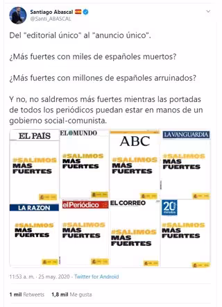"¿Más fuertes con miles de españoles muertos? ¿Más fuertes con millones de españoles arruinados? --se ha preguntado el presidente del partido, Santiago Abascal--. Y no, no saldremos más fuertes mientras las portadas de todos los periódicos puedan estar en manos de un gobierno social-comunista".