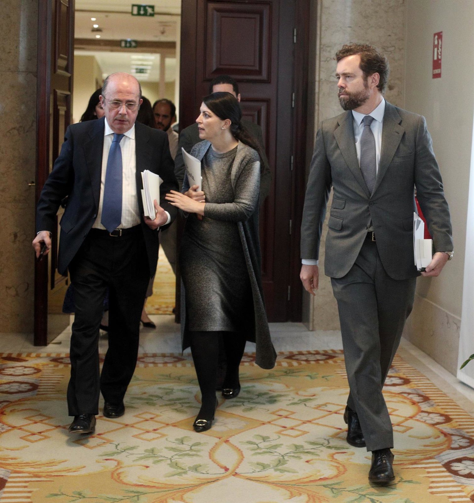 El portavoz VOX en el Congreso de los Diputados, Iván Espinosa de los Monteros (dech) y la secretaria general del Grupo Parlamentario de VOX, Macarena Olona (centro), junto al vicepresidente cuarto de la Mesa del Congreso, Ignacio Gil Lázaro (izq) - Eduardo Parra - Europa Press