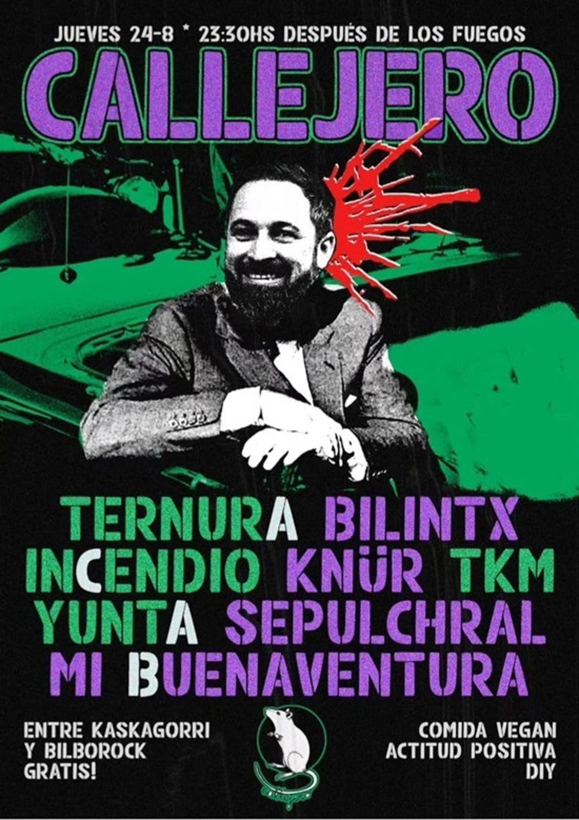 En concreto, el cartel anuncia una serie de conciertos que tendrán lugar este jueves enmarcados en un festival llamado 'Callejero' que organizan colectivos populares en el marco de la Semana Grande de Bilbao, pero fuera del programa oficial del Ayuntamiento de la ciudad. En el cartel puede verse en primer plano a Abascal sonriendo en una imagen en blanco y negro y tras él, a la altura de su nuca, una salpicadura de color rojo que simboliza la sangre.