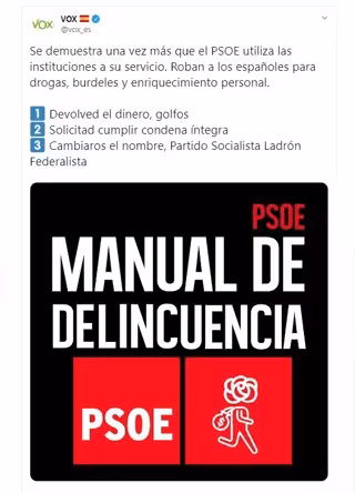 Si por la mañana el portavoz de Vox en el Congreso, Iván Espinosa de los Monteros, identificaba al PSOE como "uno de los partidos que más ha robado" en España, por la tarde la cuenta oficial del partido en la red social Twitter ha dado un paso más y ha tachado de "golfos" y "ladrones" a los socialistas.
