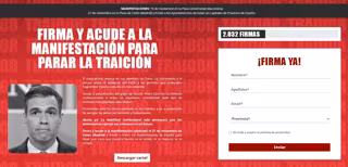 A la vez, el partido liderado por Santiago Abascal ha iniciado una recogida de firmas --en una web llamada 'sanchezveteya.es'--. "Firma y acude a la manifestación para parar la traición", anima a sus afiliados y simpatizantes.