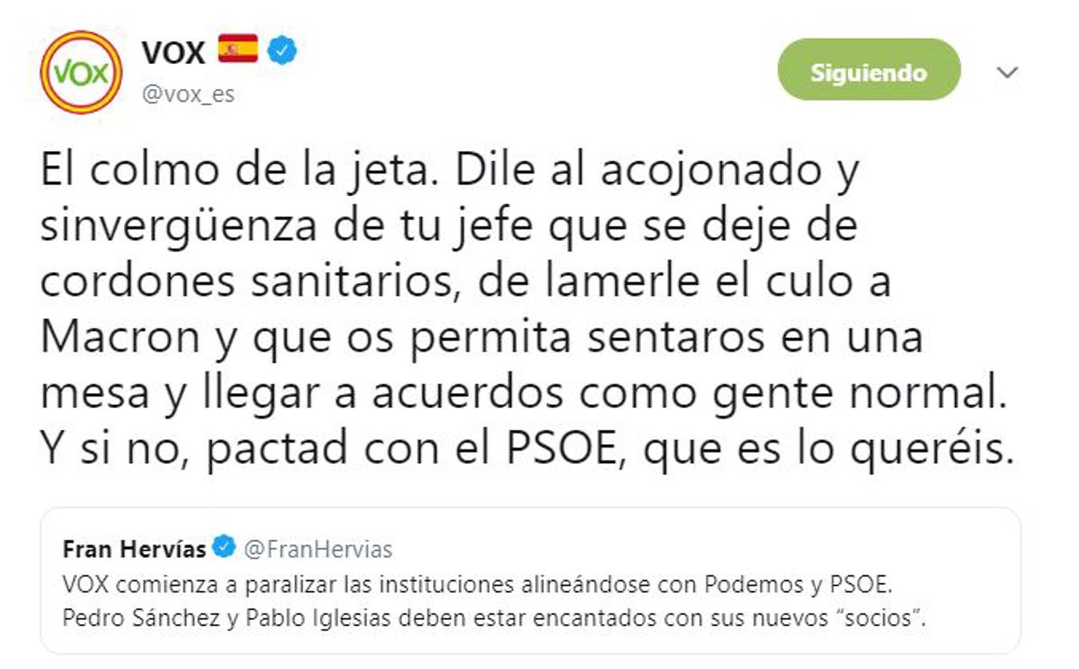 "El colmo de la jeta. Dile al acojonado y sinvergüenza de tu jefe que se deje de cordones sanitarios, de lamerle el culo a Macron y que os permita sentaros en una mesa y llegar a acuerdos como gente normal. Y si no, pactad con el PSOE, que es lo queréis", ha escrito Vox desde su cuenta de Twitter.