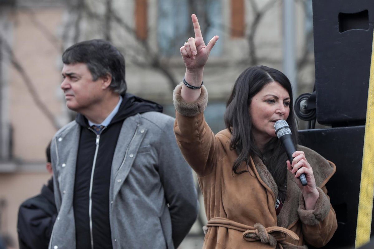 El diputado del PP por Granada, Carlos Rojas y la secretaria general del grupo parlamentario de Vox en el Congreso de los Diputados, Macarena Olona muestran su apoyo a los manifestantes concentrados en la Plaza de Neptuno en rechazo a la no autorización - Jesús Hellín - Europa Press