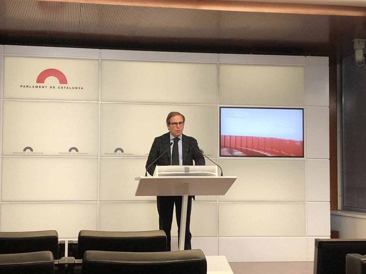 El portavoz de Vox en el Parlament, Joan Garriga, en rueda de prensa este martes en el Parlament. - EUROPA PRESS