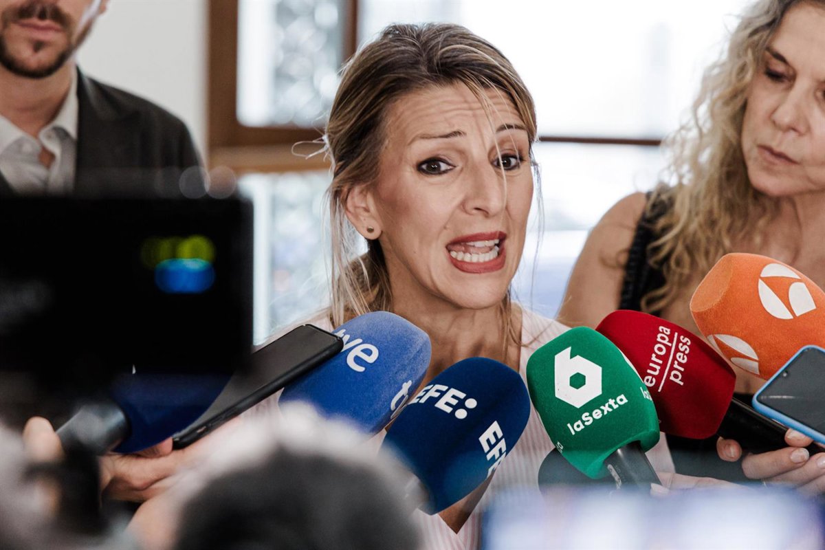 Archivo - La vicepresidenta segunda y ministra de Trabajo y Economía Social, Yolanda Díaz (2i), atiende a los medios de comunicación a su llegada al Encuentro de cooperativas energéticas, en el Ateneo de Madrid, a 17 de julio de 2025, en Madrid (España). - Carlos Luján - Europa Press - Archivo