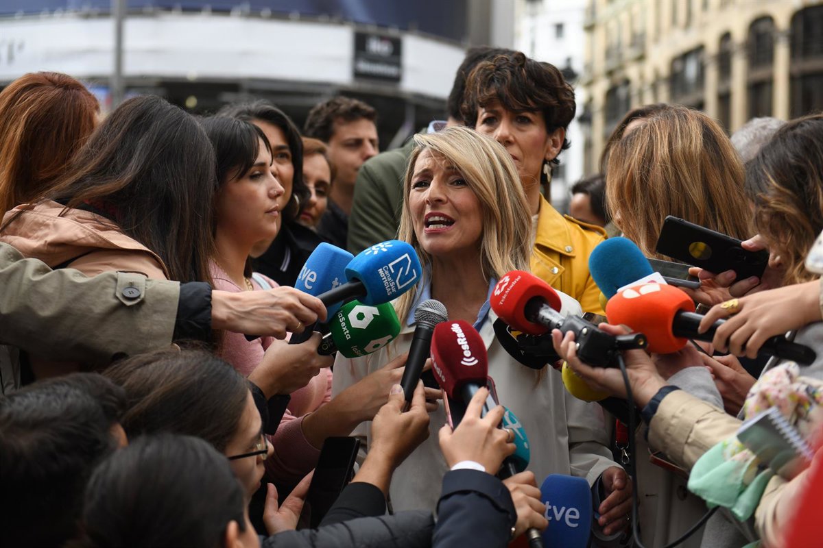 La vicepresidenta segunda y ministra de Trabajo, Yolanda Díaz, ofrece declaraciones a los medios durante la manifestación por el Día del Trabajador, a 1 de mayo de 2025, en Madrid (España). - Fernando Sánchez - Europa Press
