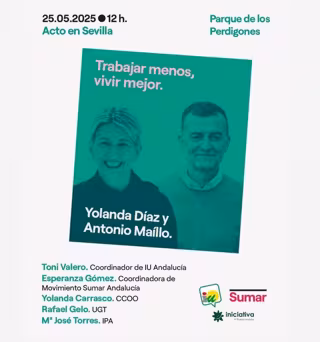 En concreto, el acto está programado para las 12,00 horas de este domingo en el Parque de los Perdigones de la capital andaluza con el lema 'Trabajar menos, vivir mejor', y congregará también al coordinador de IU Andalucía y diputado de Sumar por Málaga en el Congreso, Toni Valero, y a la coordinadora de Movimiento Sumar Andalucía y diputada andaluza de Por Andalucía, Esperanza Gómez.
